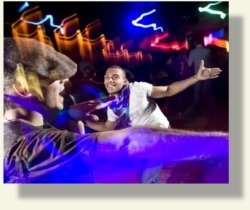 The ballroom is a mist of fog with black velour drapes, hanging chase lighted sculptures, black flittered pillars, neon sabers, strobe lighted bar facades, and neon “Go Go” cages!!
